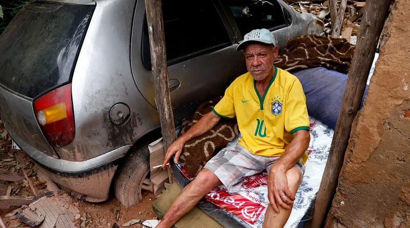 Na comunidade Três Moinhos, em Juiz de Fora, o morador Gilvan Leal Luzia, de 55 anos, passa dia e noite em um colchão posicionado no que restou da garagem. De um lado, a casa destruída pela lama. Do outro, parte do carro soterrada. Para se abrigar da chuva, um teto improvisado com colchonete, pedaços de telha e outros destroços. Há um mês, na noite de 23 de fevereiro, ele escapou por pouco de ser um dos mortos das enchentes e deslizamentos de terra que atingiram a Zona da Mata Mineira.