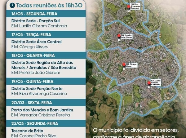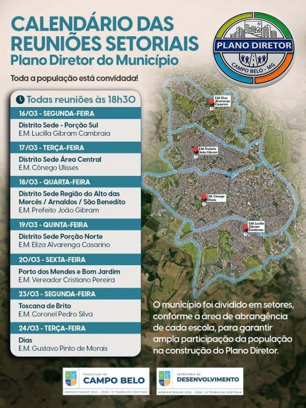 Para garantir ampla participação da população na construção do Plano Diretor, o município foi dividido em setores, conforme a área de abrangência de cada escola. Isso permitirá que mais cidadãos possam contribuir com ideias e sugestões que reflitam as necessidades de suas respectivas comunidades.